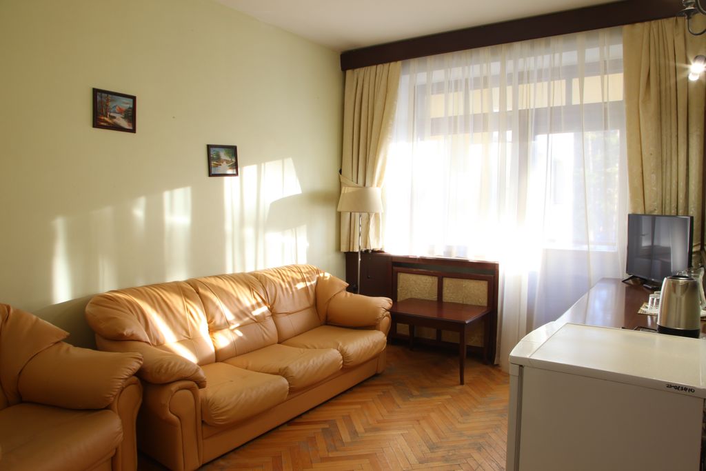 В номере: одна двуспальная либо две односпальные кровати, прикроватные тумбы, шкаф, стол, стулья, журнальный столик, мягкая мебель, кондиционер, спутниковое телевидение, холодильник, электрочайник