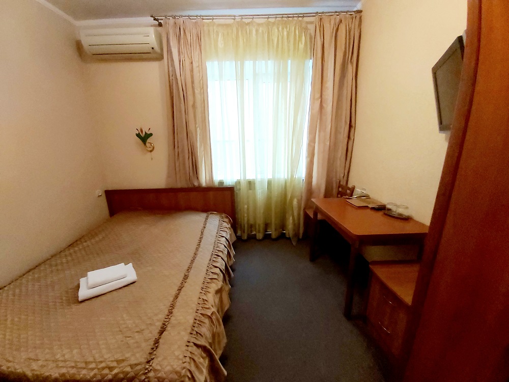 В номере: кровать двуспальная, прикроватные тумбочки, стол, стул, шкаф, кондиционер, набор посуды, телевизор, телефон, холодильник