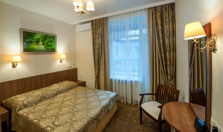 В номере: кровать двуспальная, стол, столик туалетный, стулья, гладильная доска, набор посуды, сейф, сплит-система, телевизор, утюг, холодильник, электрочайник