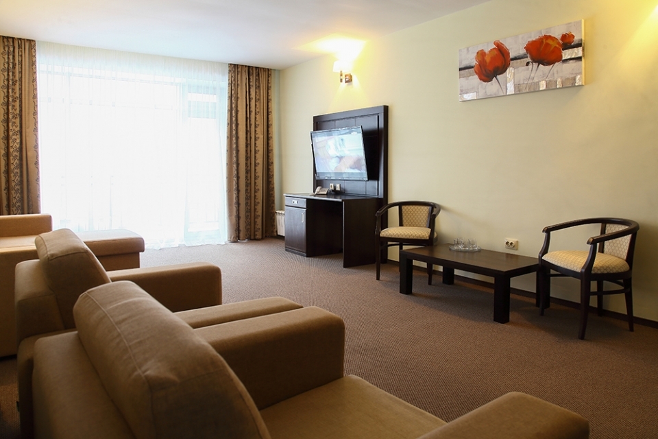 - В номере: душ, туалет, ТВ, холодильник, телефон, гостиная, двуспальная или две раздельные кровати.