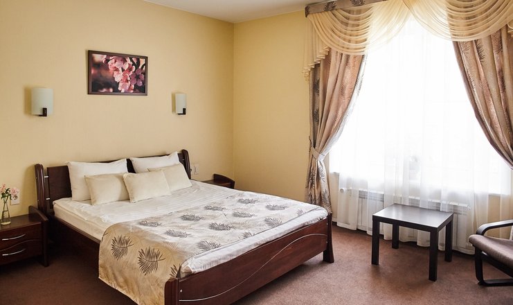 В номере: вешалка, кровать двуспальная, прикроватные тумбочки, стол, стулья, шкаф, телевизор ЖК, телефон, холодильник, чайный набор посуды, электрочайник